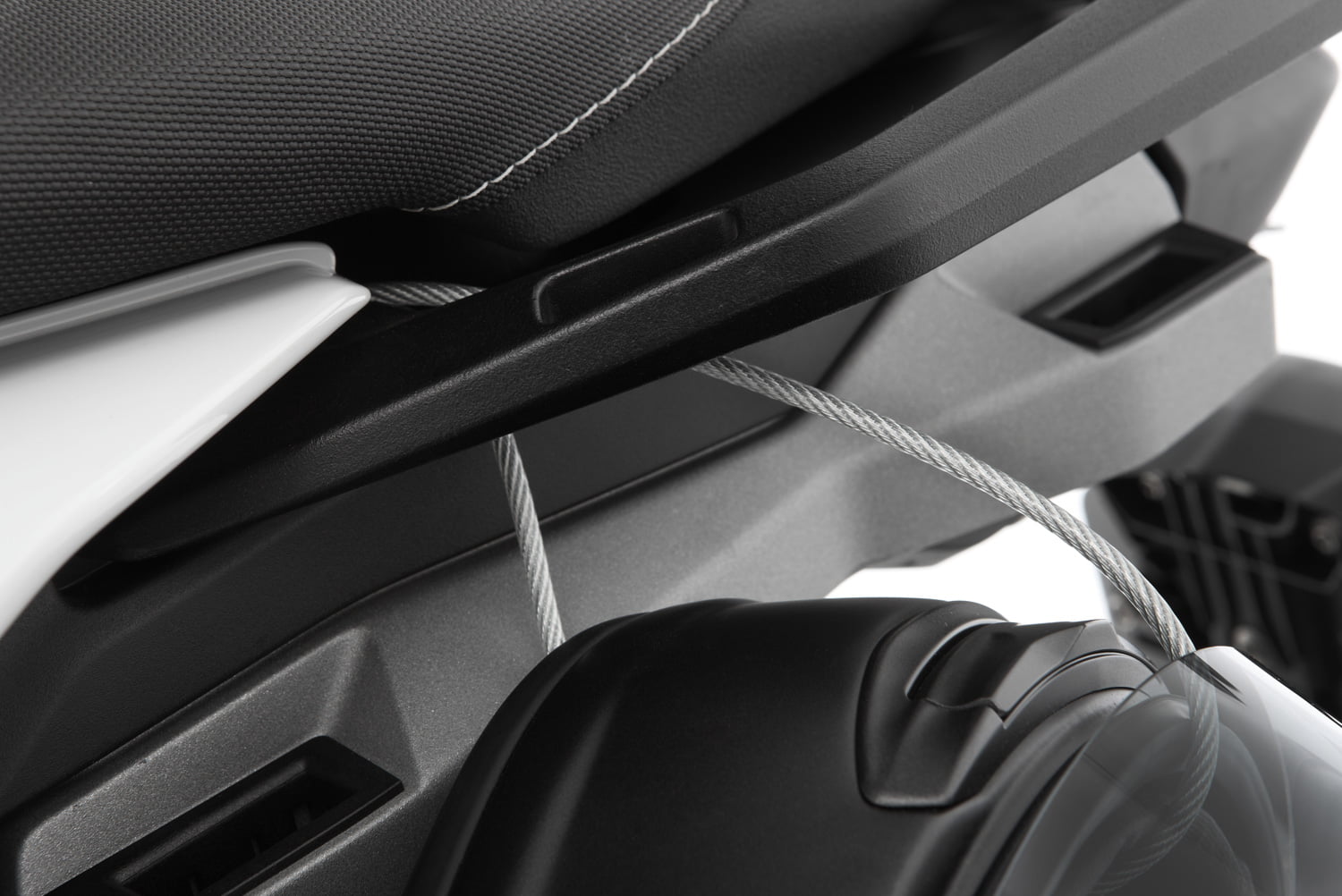De transparante, ruim bemeten omhulsel van het veiligheidstouw van siliconen beschermt helmen zoals motorfietsen tegen wrijving en lakbeschadigingen. Als het touw niet wordt gebruikt, is het altijd binnen handbereik en kan het onder de bank worden opgeborgen om ruimte te besparen.