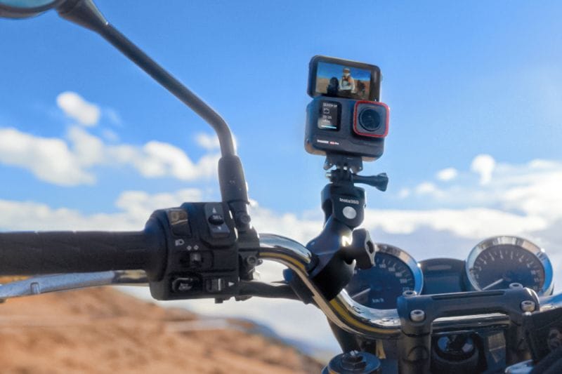 - Als je de camera rechtstreeks op de heavy-duty klem bevestigt, kun je maximaal 80 km/u rijden op vlakke wegen en 40 km/u offroad. Bevestig een selfiestick alleen op vlakke wegen en draai de klem voor gebruik vast met de meegeleverde sleutel.