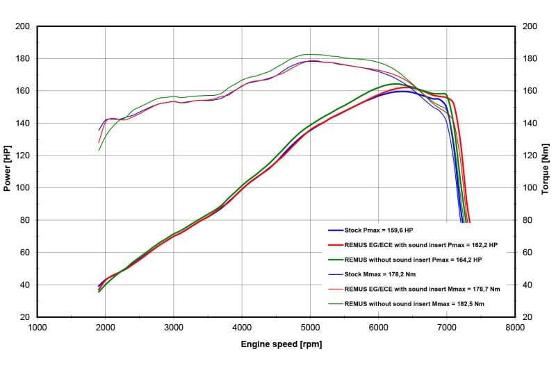 - Vermogen- en koppeltoename volgens REMUS (+2,6 pk, +0,5 Nm)