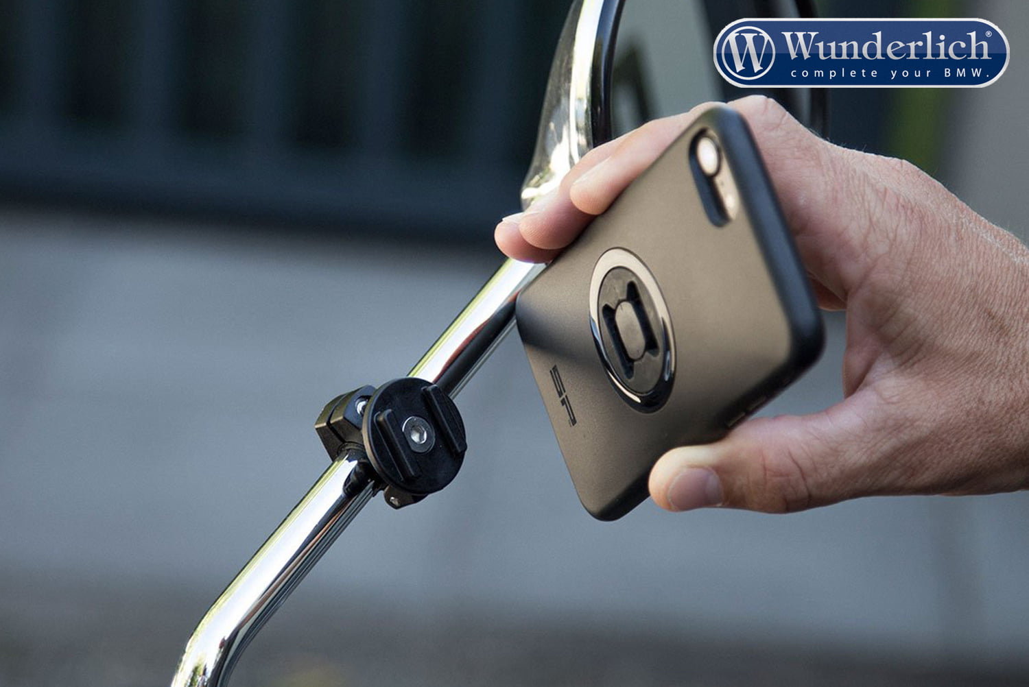Monteer de MIRROR MOUNT op de spiegel of op het stuur van je motorfiets, en je kunt je smartphone met de SP-Connect PHONE CASE (of UNIVERSAL INTERFACE) eenvoudig bevestigen door deze op de houder te plaatsen en 90 ° met de klok mee te draaien om te vergrendelen.