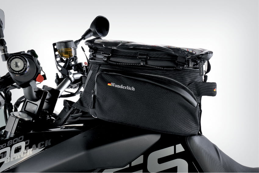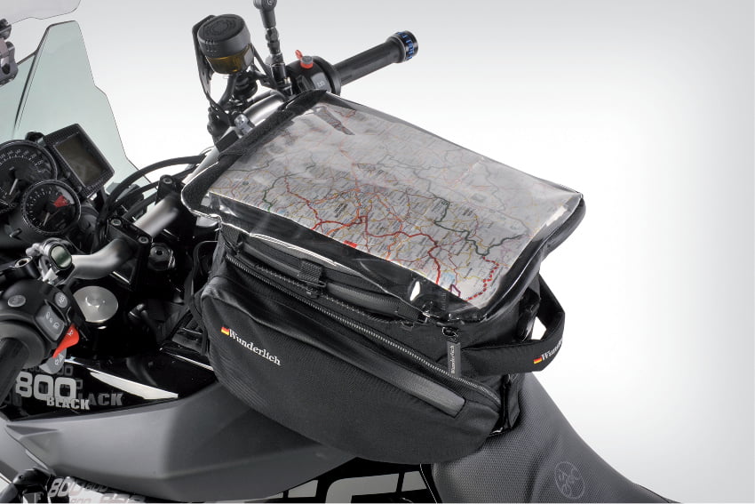 Opvouwbaar met een handvat voor het tanken. De bodemplaat kan snel worden verwijderd, maar kan ook op het voertuig blijven waardoor de lak beschermd wordt. Bovendien is de bodemplaat ook geschikt voor het apart verkrijgbare kaartenvak zonder de tanktas te gebruiken.