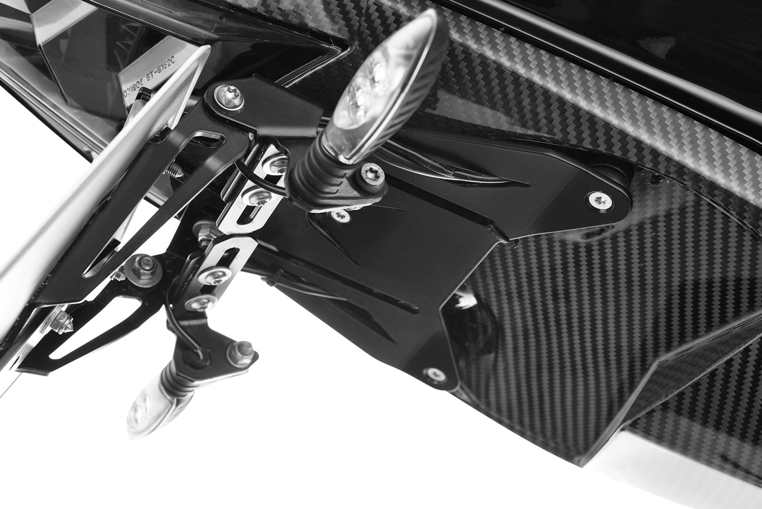 De kentekenplaathouder kan zowel in hoek worden afgesteld als dichter bij het achterwiel worden geplaatst. De kentekenplaat kan ook naar boven worden verplaatst, bijna gelijk met de achterkant.