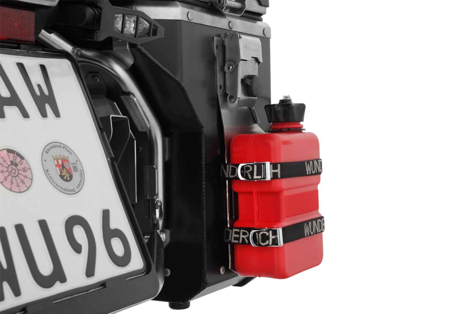 Ons kofferrek is de perfecte aanvulling op de koffer voor alles wat óf snel bij de hand moet zijn óf geen plek in de koffer heeft. Er zijn gewone reisbussen voor benzine, olieflessen en compacte voorraadbussen voor water of ander reisgerei in nodig. Wie kent de vervelende omstandigheden niet wanneer vloeistoffen lekken – vooral onderweg. En het vrijgekomen koffervolume kan zeker voor betere dingen worden gebruikt. Het solide roestvrijstalen rek is handig ontworpen om twee van onze aluminium flessen (art. Nr. 43583-000) naast elkaar te houden. Olie en benzine kunnen bijvoorbeeld gemakkelijk afzonderlijk worden vervoerd. Het wordt vastgezet met spanbanden en de sjoropeningen die in het rek zijn geïntegreerd. Onze praktische spanbanden (art.nr. 25120-012) zijn perfect om allerlei voorwerpen aan het rek te bevestigen.
