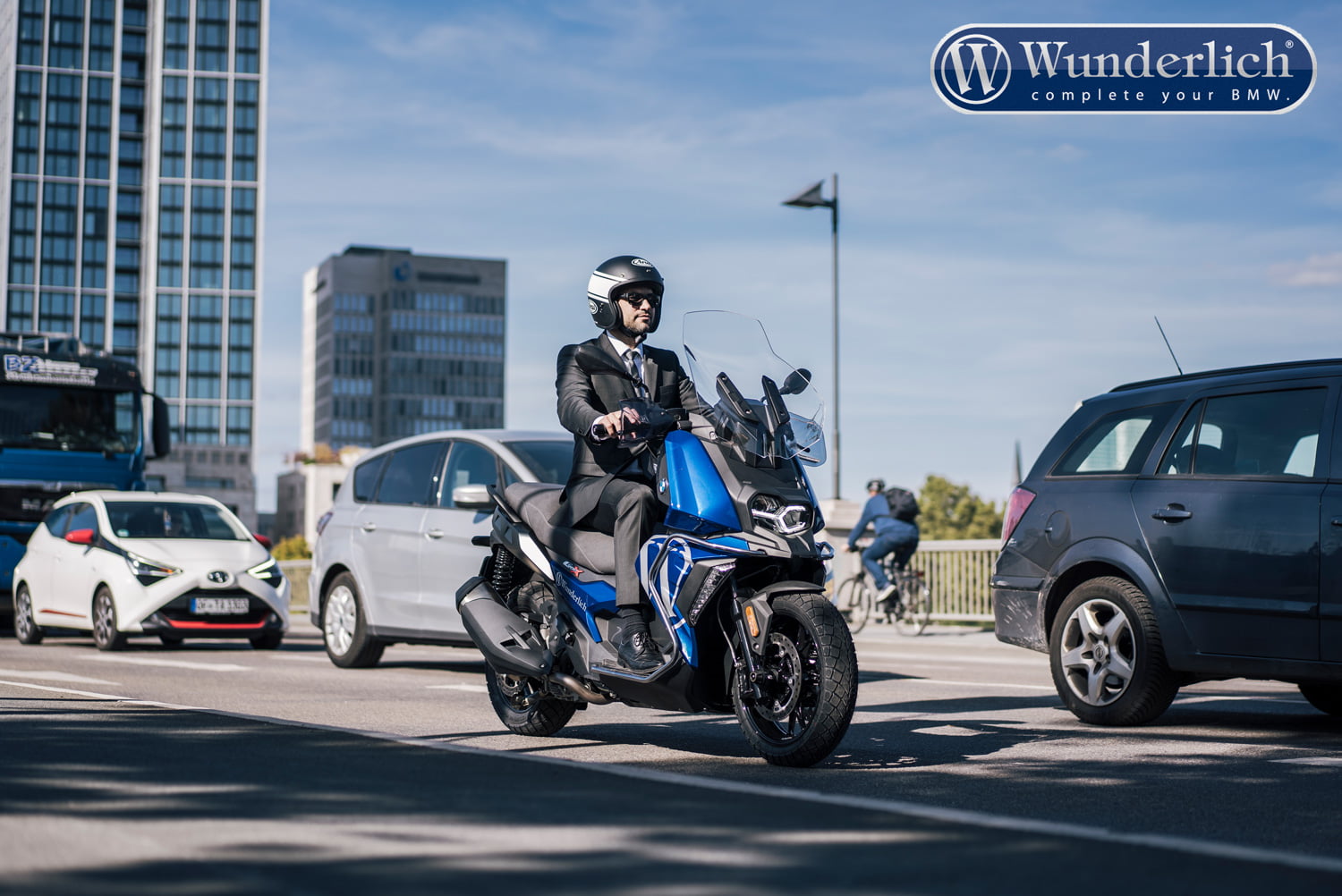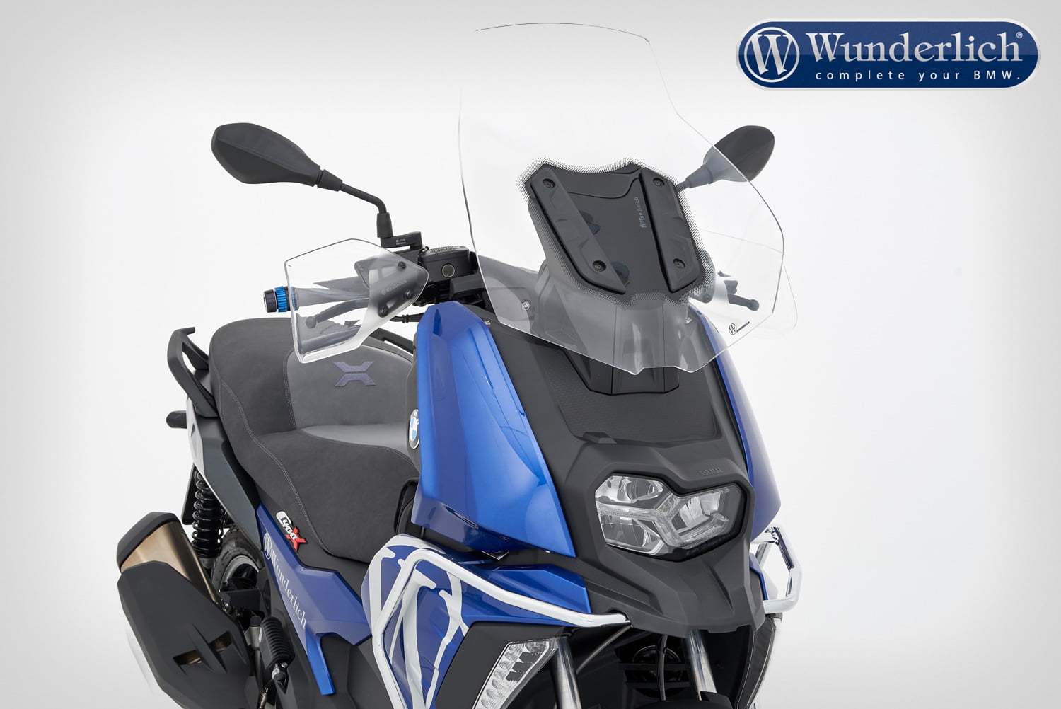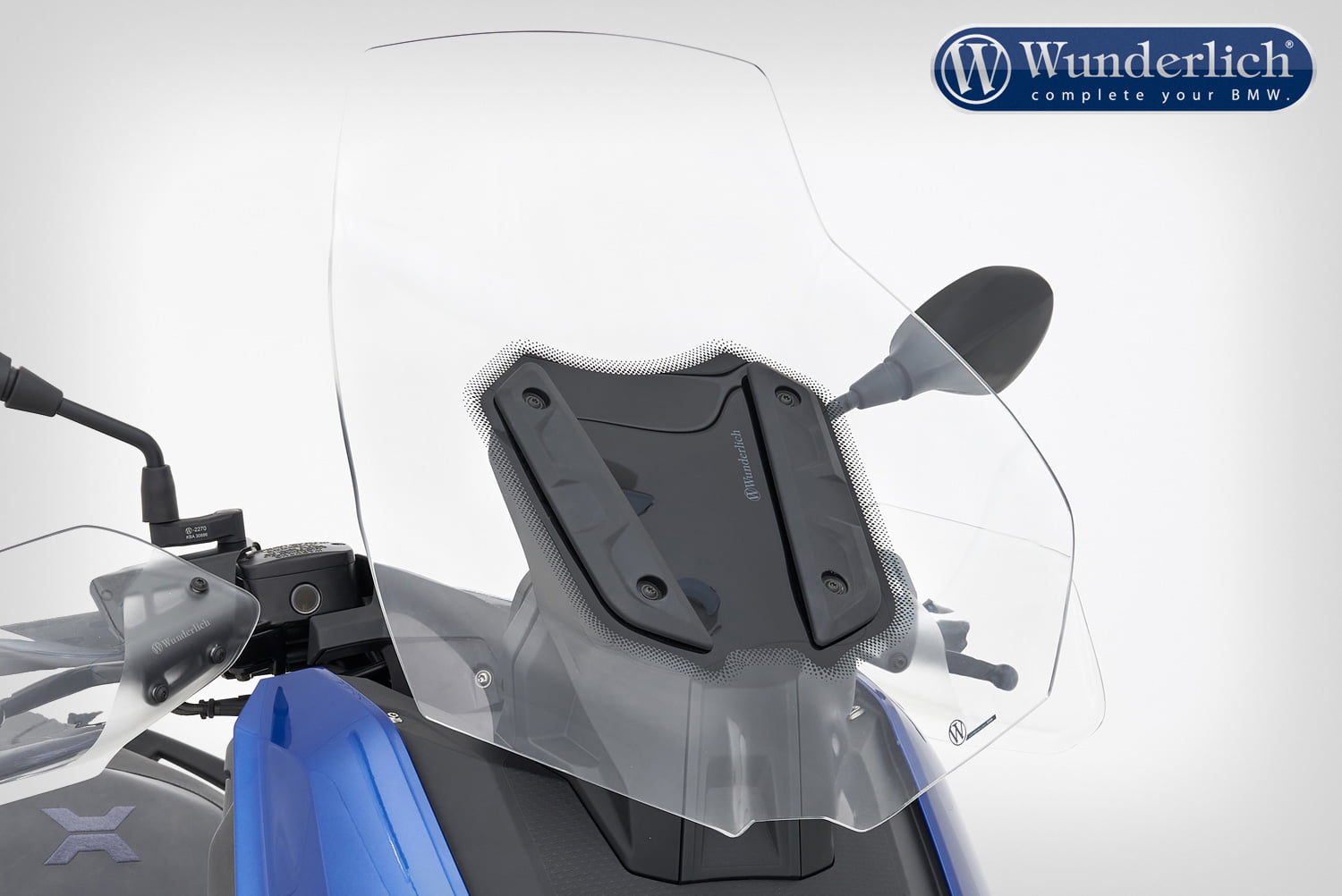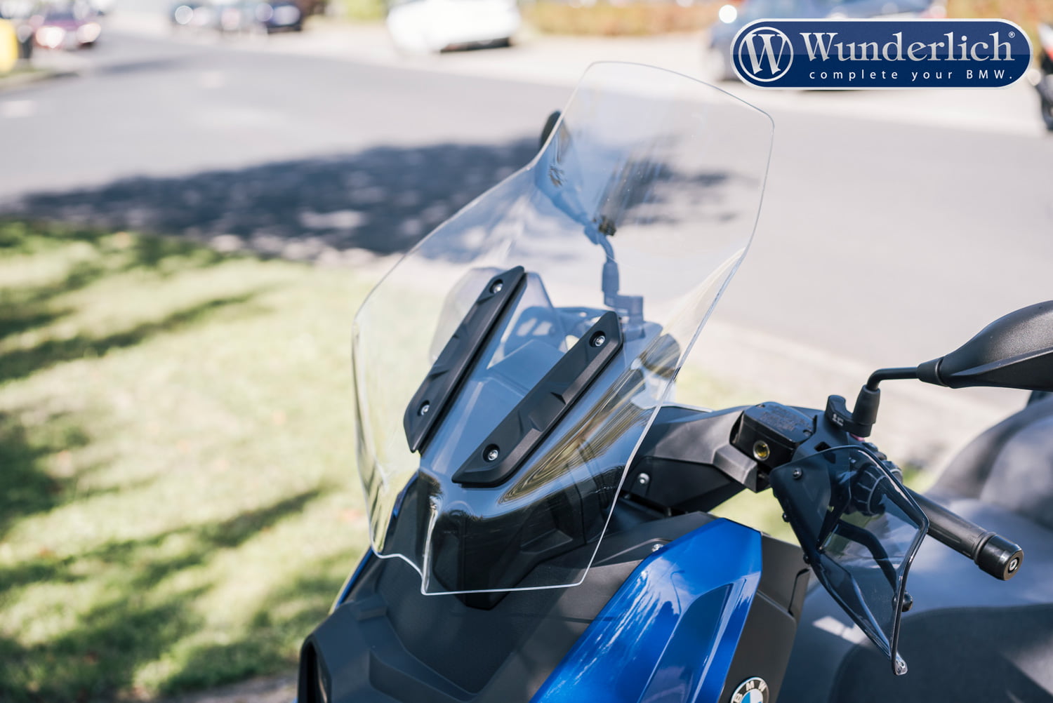 Onze elegante, transparante “MARATHON” -lens zorgt voor optimaal comfort en bescherming in stedelijke omgevingen en tijdens lange tochten en hoge snelheden. Het helt naar de bestuurder toe en is zo aerodynamisch gevormd dat het effectief dempt, kalmeert en turbulentie tot een minimum beperkt. Dit wordt geholpen door het feit dat Wunderlich-ruiten, vanwege de met de hand gepolijste, afgeronde rand, over het algemeen geen randbescherming nodig hebben die extra trillingen, geluiden of turbulentie zou kunnen veroorzaken. Het is onderaan breder gedimensioneerd dan de originele lens en biedt perfecte bescherming tegen weersinvloeden voor elke lichaamsgrootte. Het integreert perfect in de algemene lay-out van de C 400 X. Het ontlast het bovenlichaam, de armen en het hoofd van de windbelasting, vooral bij hoge snelheden. De 5 mm dikke ruit van hoogwaardig PMMA is optisch zuiver en zorgt voor een vervormingsvrij beeld en een optimaal, helder zicht. Het wordt gekenmerkt door zijn hoge stijfheid van componenten, vormvastheid en krasbestendigheid.