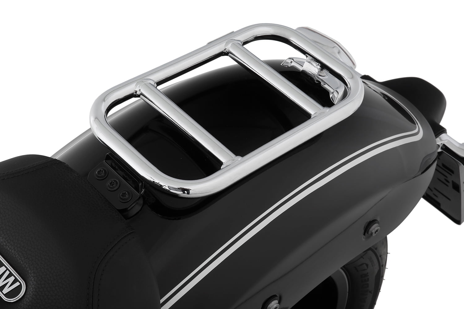 Wij vervaardigen het bagagerek van 18 mm dikke, verchroomde stalen precisiebuizen. Dezelfde bevestigingspunten voor het duozadel dienen als solide basis voor bevestiging. Het halfronde chromen achterpaneel blijft natuurlijk behouden. Dankzij de ongecompliceerde, doordachte montage kunnen de bagagedrager en het duozadel eenvoudig en met weinig inspanning naar wens worden verwisseld.