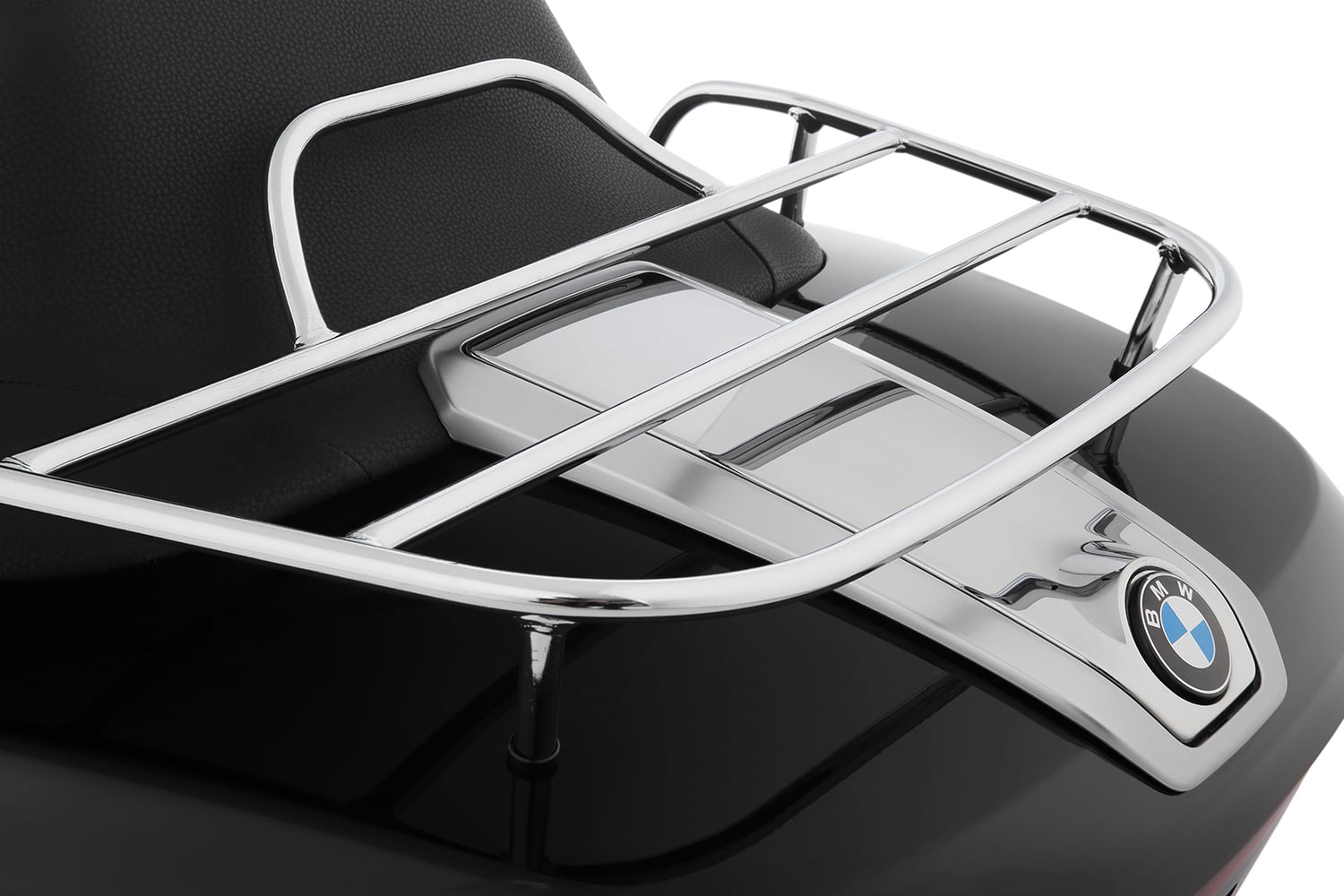 Het is een exclusieve, uitvoerig ontworpen reling voor de topkoffer van de R18 Transcontinental, die zowel elegant als functioneel is. Zo zet hij een designaccent en blijft hij tegelijkertijd uiterst functioneel: hij biedt plaats aan extra bagage of alles wat onderweg snel bij de hand moet zijn of dat niet in de topkoffer hoort, zoals een nat regenpak .