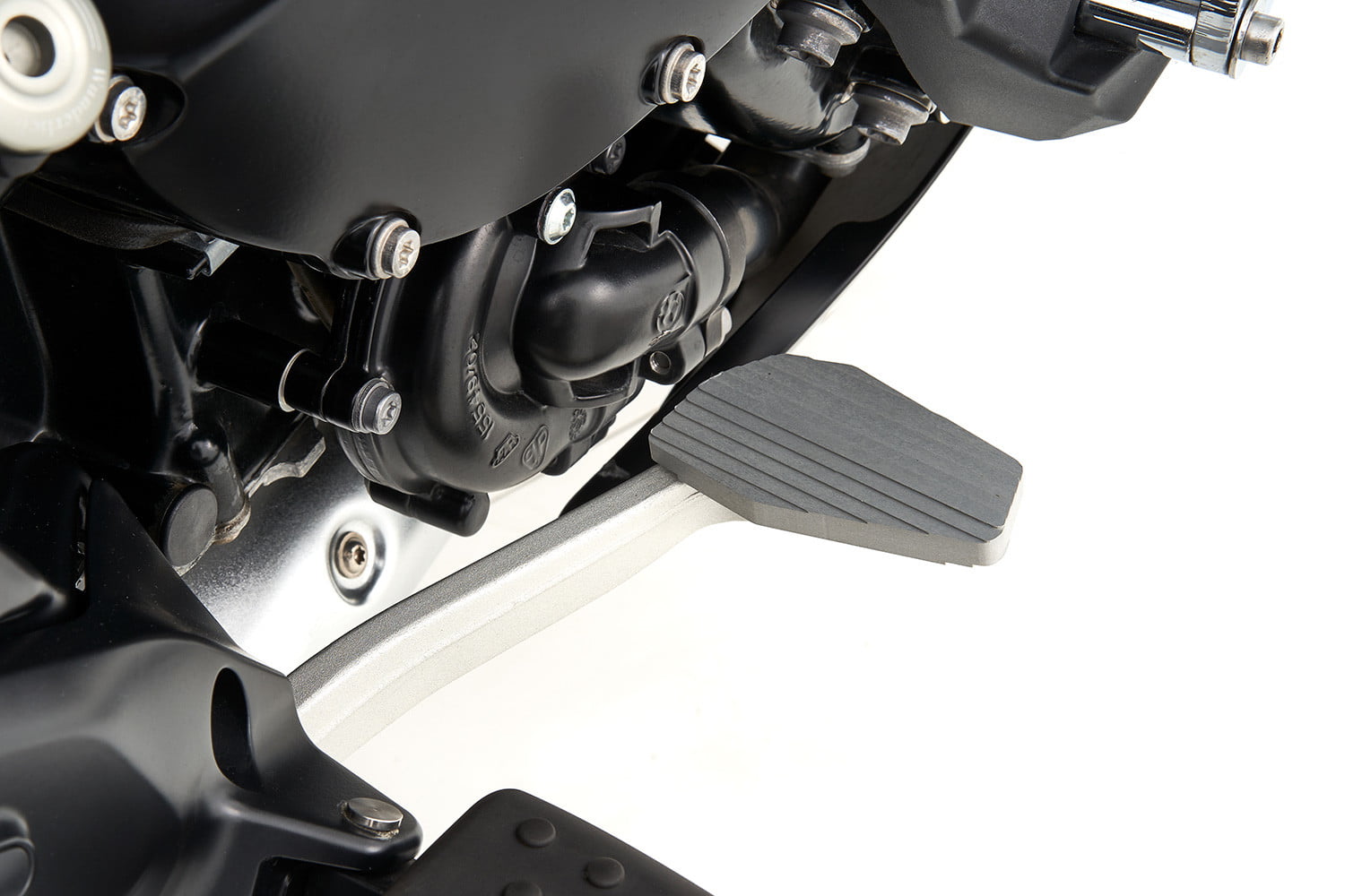 Bij het origineel is het voetsteungedeelte van de remhendel helaas wat klein en vormt het vaak een veiligheidsrisico Bij de vergroting is uitglijden of in de ruimte trappen bijna onmogelijk. Je zult deze innovatie pas echt waarderen als je het eenmaal hebt geprobeerd. Uitgebreid gefreesd en geanodiseerd.