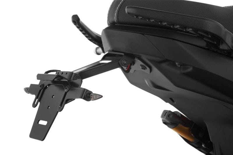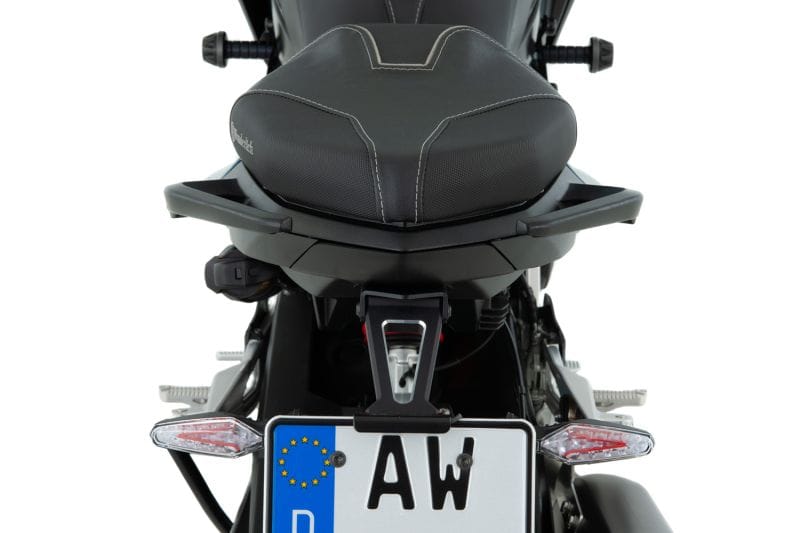 De ombouwset elimineert de visueel dominante – velen omschrijven deze zelfs als omvangrijk – lange wieldop en vervangt het achterlicht door een gereduceerde, harmonieus geïntegreerde versie. Het precies passende, schelpvormige achterpaneel van onze set sluit de opening eronder af die ontstaat bij het verwijderen van de originele wieldop en het achterlicht. Het vormt tevens de basis voor onze sportieve, gestripte kentekenplaathouder – waarvan het verlengstuk is gemaakt van gefreesd aluminium – en een klein achterlicht. De hoek van de kentekenplaat is verstelbaar en de houders voor de originele 3-in-1-knipperlichten zijn voorbereid, zodat ze eenvoudig kunnen worden hergebruikt. De kentekenplaathouder zelf is gemaakt van roestvrij staal. De adapterkabels voor de eenvoudige, comfortabele elektrische aansluiting van de richtingaanwijzers en de meegeleverde E-gemarkeerde led-kentekenplaatverlichting zijn voorbereid. Deze kunnen worden weggewerkt in de daarvoor bestemde kabelgoten. Tot slot is de benodigde (verwijderbare) reflector inbegrepen.