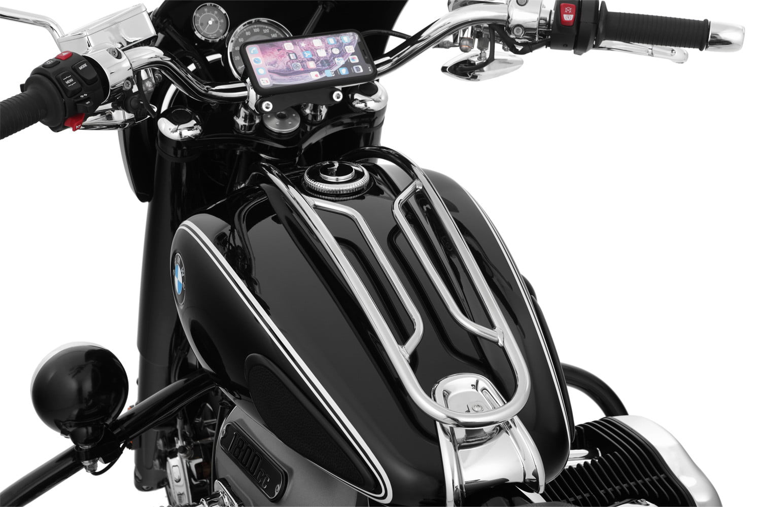 Deze tankrail zet de kroon op de tank in de ware zin van het woord. Zelfs de standaard diepzwarte tank van de R 18 ziet er zeer stijlvol en klassiek uit in combinatie met het chroom van de tankdop, het tankpaneel en het BMW logo. Onze tankrails onderstrepen deze gecoördineerde indruk op drie manieren. Met zijn stijlvolle, functionele vorm, de buizen zorgvuldig op elkaar afgestemd in hun respectieve afmetingen en de hoogglans chromen oppervlakken, die in tegenstelling tot de glanzend zwarte tank tot hun recht komen. Op korte afstand van de tank volgt de vorm van de tankrail precies zijn curve en integreert vakkundig de tankdop en het verchroomde tankpaneel aan de zadelzijde.