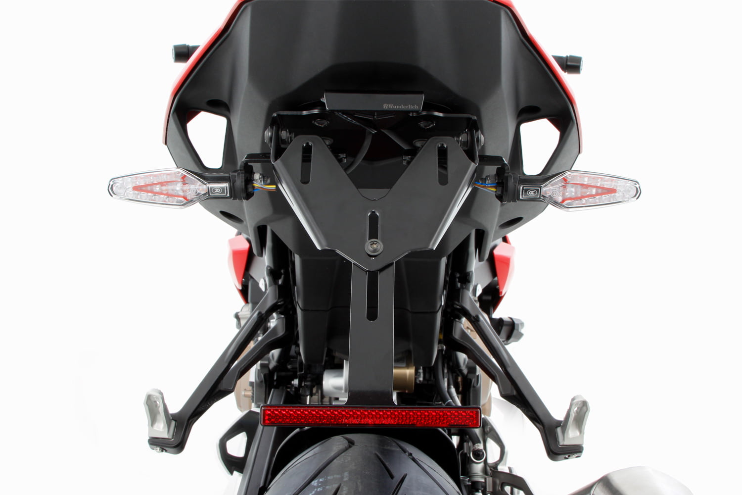 Na het demonteren van de originele kentekenplaathouder ontstaat een vuistgrote opening onder de zitbank, die permanent wordt afgesloten met een precies passend komvormig paneel dat bij de kentekenplaathouder wordt meegeleverd. Hij blijft op zijn plaats op de weg en tijdens het racen en dient tevens als basis voor onze afneembare kentekenplaathouder. Bovendien heeft de kentekenplaathouder “TRACKDAY” alle typische kenmerken van een kentekenplaathouder van Wunderlich: de hellingshoek van de kentekenplaat is verstelbaar en bevestigingen voor de originele richtingaanwijzers zijn voorbereid. Het geheel wordt afgerond met een discrete led-kentekenplaatverlichting met E-keur.
