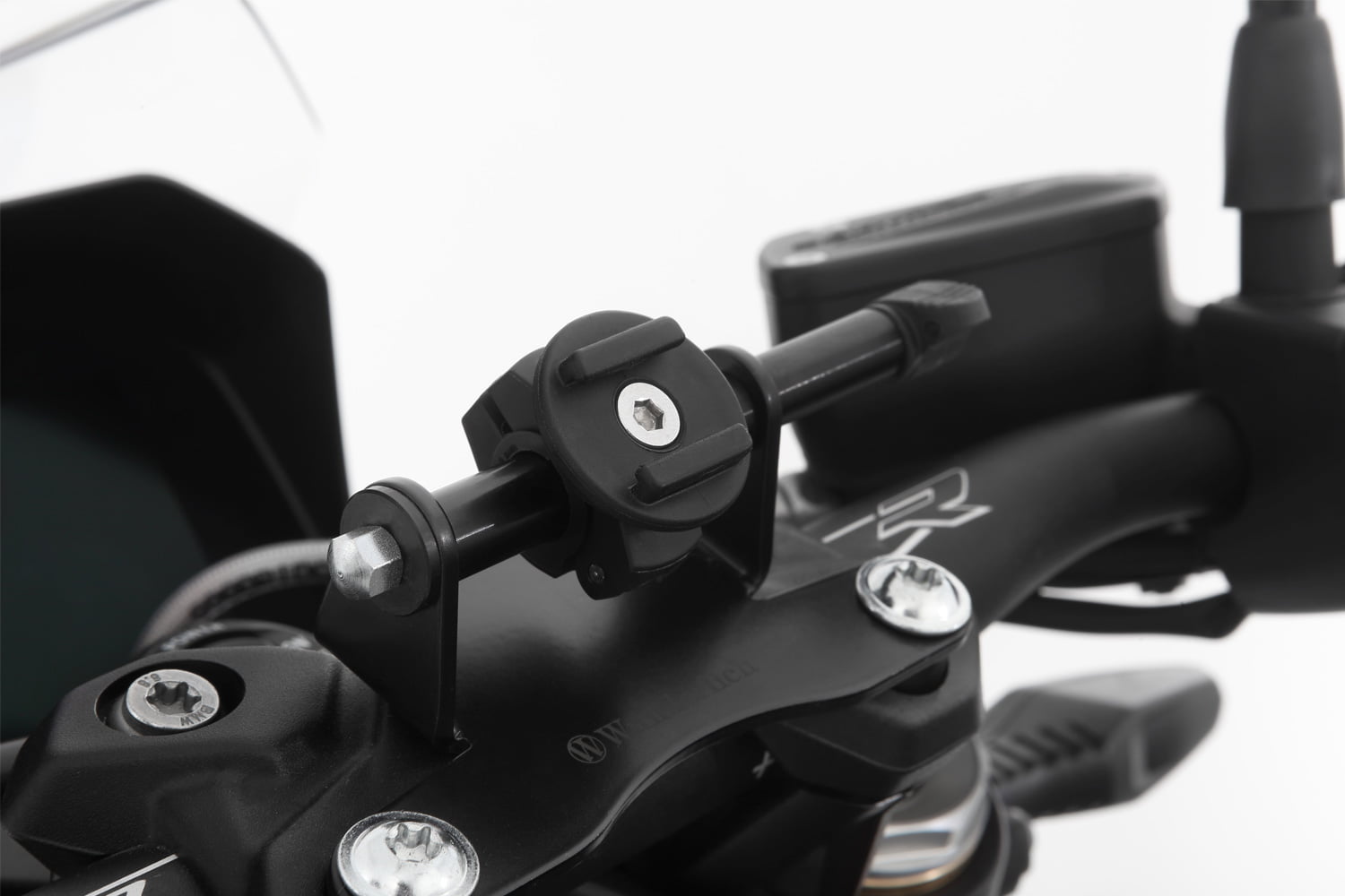 Met deze universele apparaatdrager hebben we een basis ontwikkeld waarop onze universele navigatiehouder (21098-000), de Multiclamp-adapter (45155-402) of de SP-Connect smartphone-systeemspiegelbundel (45151-0), maar ook andere smartphone en navigatiesystemen -Bevestigingssystemen kunnen ergonomisch op de stuurklem worden geplaatst. Met zijn cilindrische houder (lengte 59 mm, Ø 13 mm) hebben we de basishouder zo ontworpen dat bijna alle gangbare bevestigingssystemen ermee compatibel zijn.