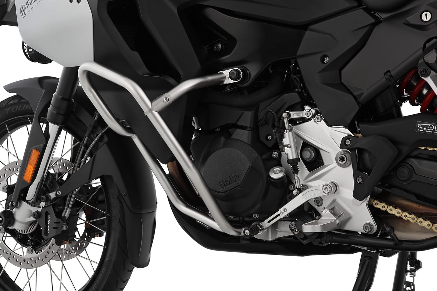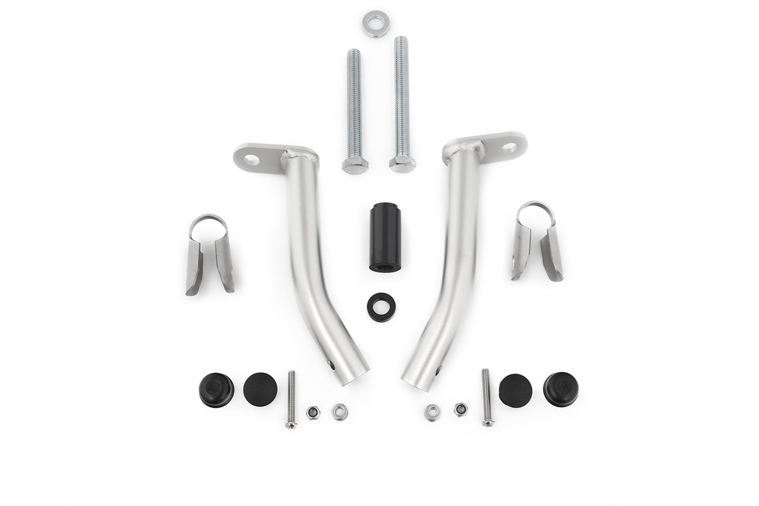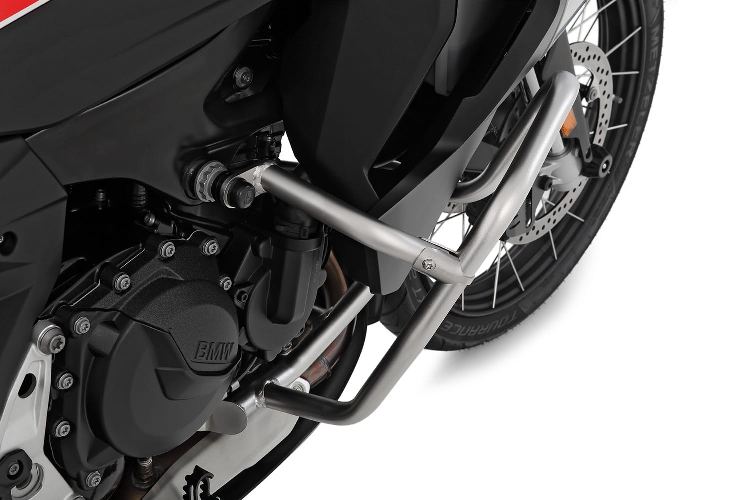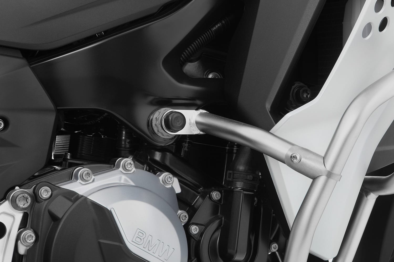 Met de verstevigingsbeugel van hoogwaardig roestvrij staal elimineren we deze tekortkoming betrouwbaar. Het verbindt het achterste, vrije uiteinde van de motorbeschermbeugel met het frame. Dit betekent dat er via de beugel op de juiste plaats extra krachten in de frameconstructie worden geïntroduceerd. Deze maatregel voorkomt dat de motorbeveiliging bezwijkt en verkleint de kans op schade aan de koppelings- of dynamodeksels. Het zorgt voor extra stijfheid over het gehele leidingnetwerk en is zo ontworpen dat de gebogen vorm tevens zorgt voor een elastische reductie van eventueel optredende belastingspieken.