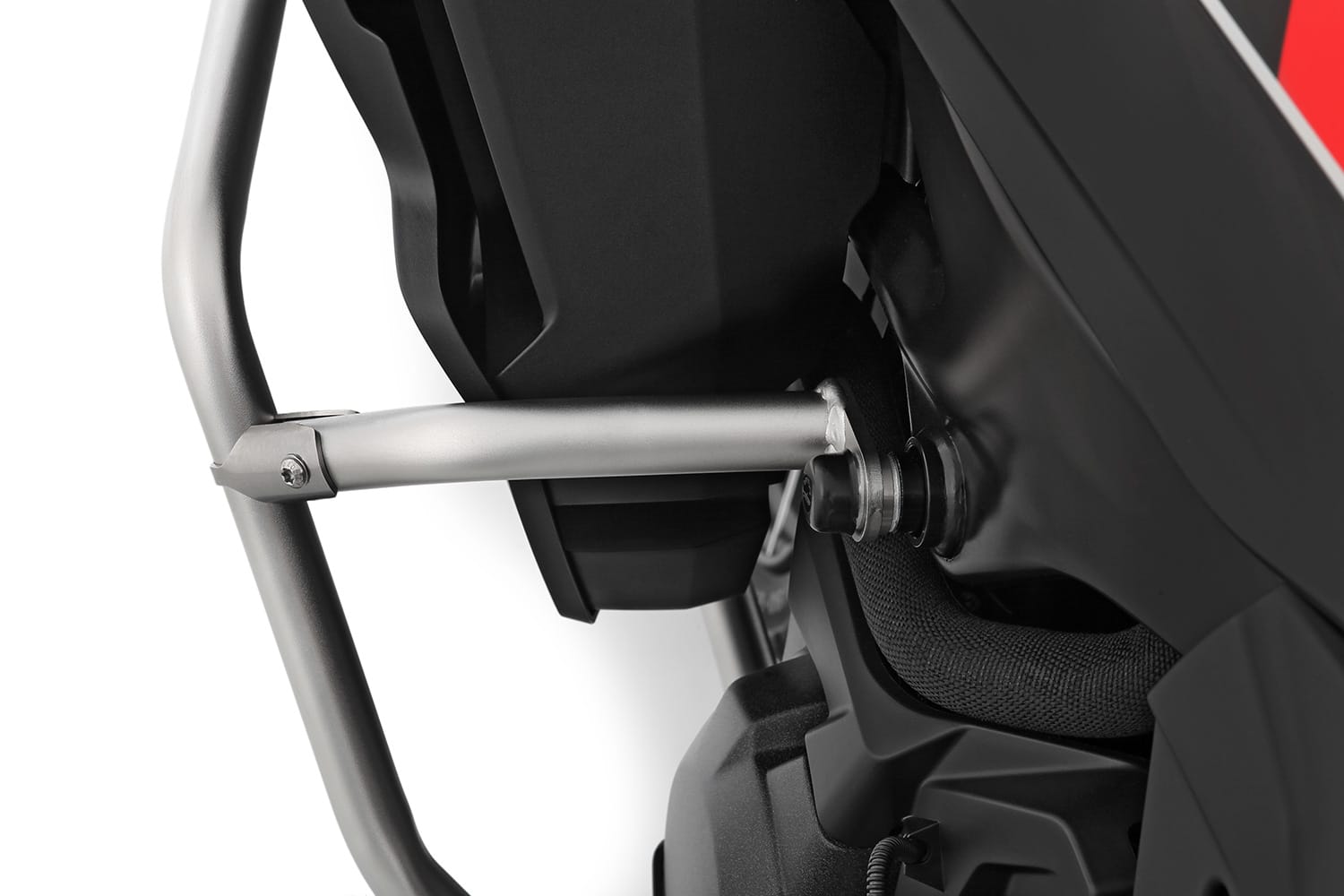 - Het achterste, vrije uiteinde van de originele motorbeschermbeugel van de Adventure heeft geen steun tegen het frame en vormt daarom de achilleshiel van de motorbeschermbeugel