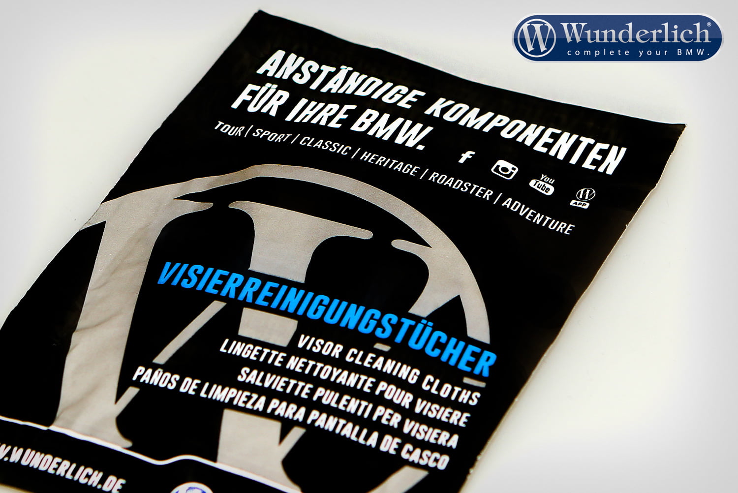 De Wunderlich-poetsdoeken in een nieuw design met 2-fasenreiniging garanderen een zachte, krasvrije en streeploze reiniging van helmvizieren, tourramen en koplampen. Daarnaast hebben de poetsdoeken een antistatische werking en verwijderen ze ook hardnekkig vuil zoals insecten etc.